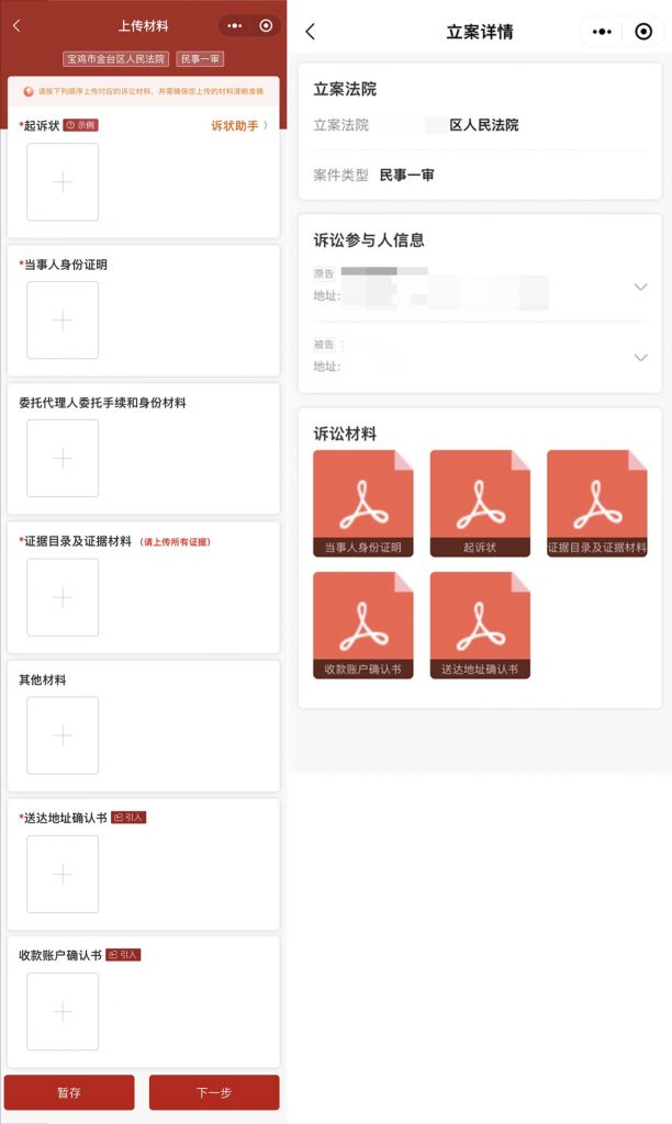 上传材料中带*必填,其余可不填。所需材料包括起诉状、当事人身份证明、证据材料、送达地址确认书和收款账户确认书可选择由系统引入添加联系方式和地址即可。